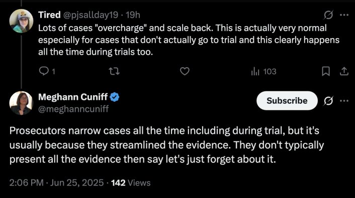 “Prosecutors narrow cases all the time—including during trial—but it’s usually because they’ve streamlined the evidence,” she noted. “They don’t typically present all the evidence and then say, ‘Let’s just forget about it.’”