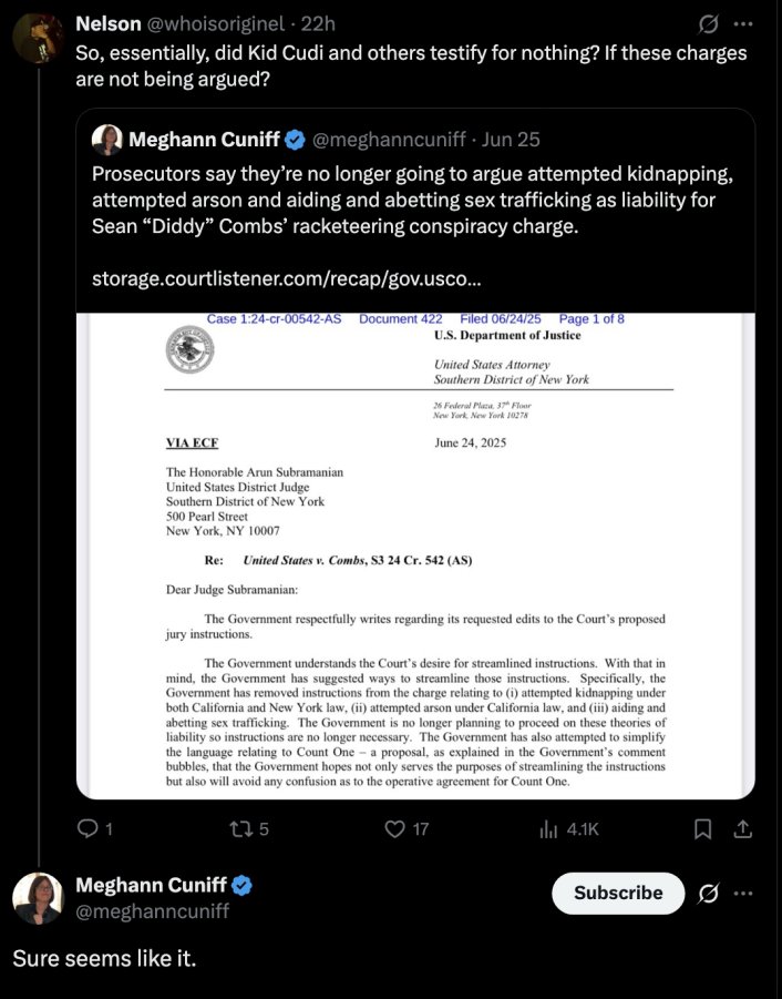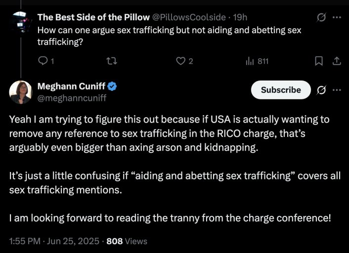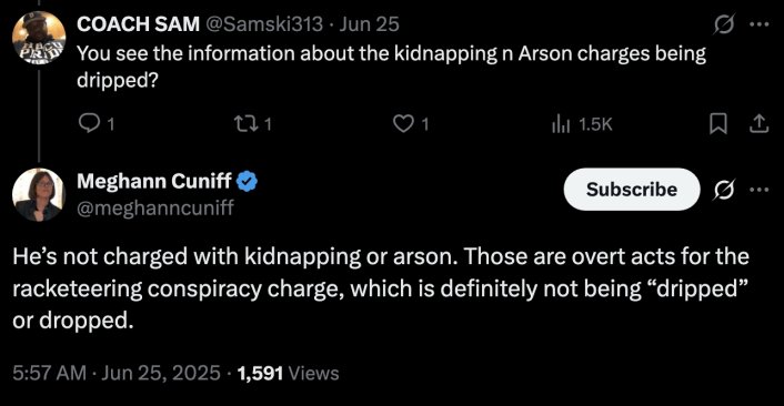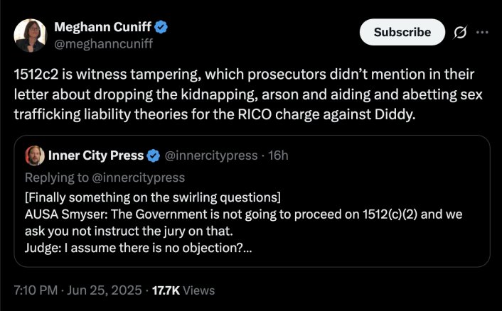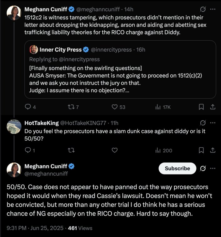 Legal journalist Meghann Cuniff weighed in on the developments, calling the case “a joke” compared to other federal RICO trials she’s covered. Posting on X, Cuniff said she gives the outcome a “50/50” chance of going either way.