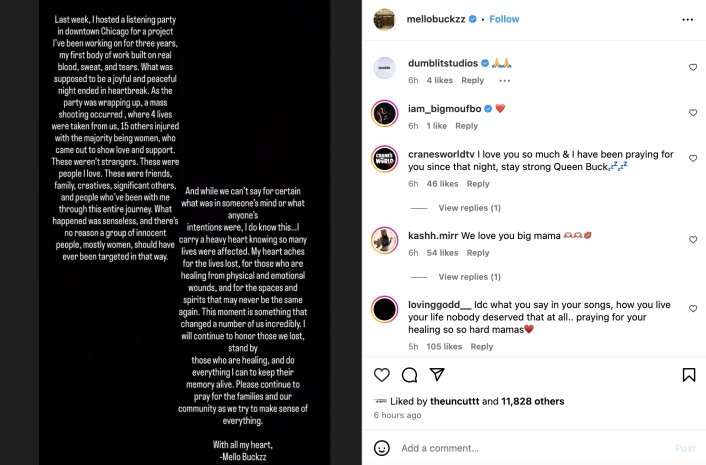 In a heartfelt statement posted on Instagram, Mello Buckzz shared that the victims were not strangers to her, but rather "friends, family, creatives, significant others, and people who’ve been by my side throughout this entire journey."