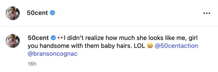 50 Cent trolled Tompkins on Instagram by reposting the TMZ story and commenting on her looks, writing, "👀I didn’t realize how much she looks like me, girl you handsome with them baby hairs. LOL 😆"